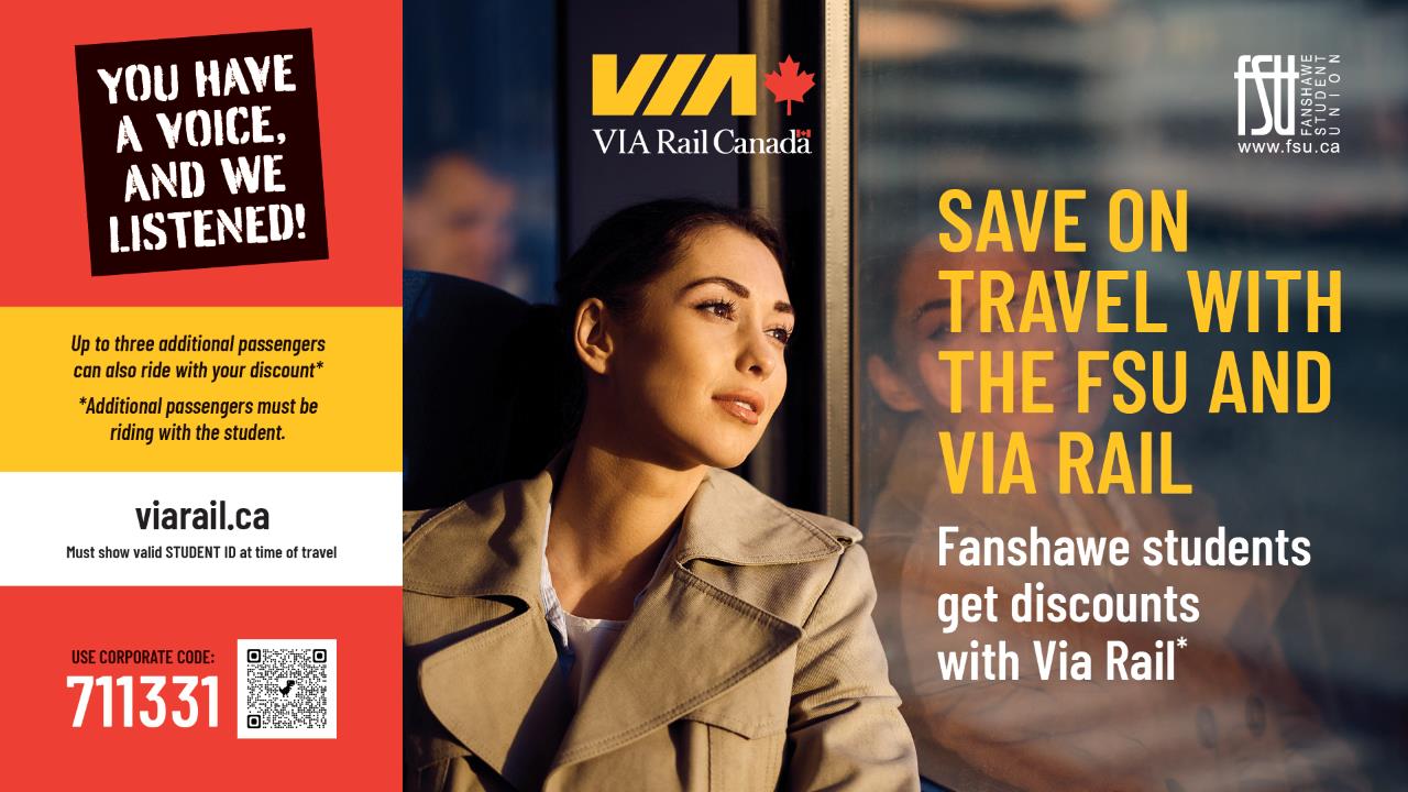 Fanshawe students can save on holiday travel with an exclusive VIA Rail Canada discount! Fanshawe students can get 7.5% off each ticket (up to a maximum of three tickets) when you book using this link.